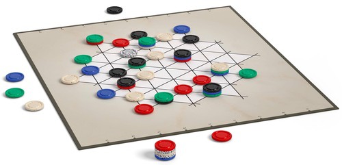 The game is played with 48 pieces in six colors. At the start of play, all colors are neutral and do not belong to any player. During the course of the game, both players must choose two colors. The goal is to make piles of five pieces of different colors whose top color is their own. Whoever has clever tactics, plans for the future, and uses the possibility of multiple moves on stones of their own color will ultimately win with a majority of the 5-stacks.