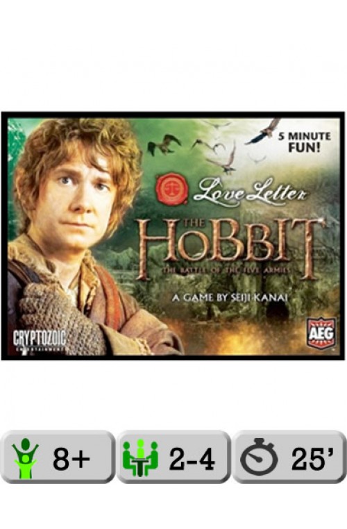 Love Letter: The Hobbit – The Battle of the Five Armies is a game of risk, deduction, and luck for 2–4 players based on the original Love Letter game by Seiji Kanai. The deck consists of 17 cards, with the Arkenstone being valued #8, Bilbo Baggins #7, and so on down to The One Ring at #0.