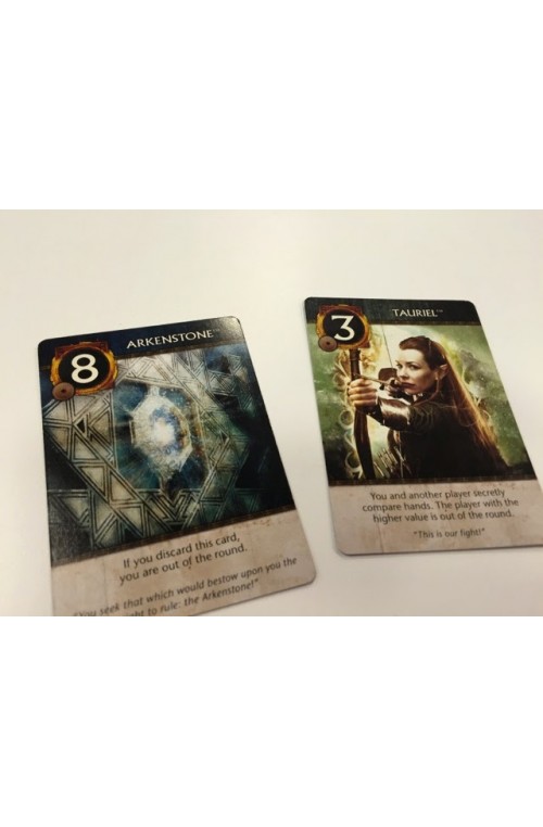 In addition to the one extra card, LL: The Hobbit differs from the original game in that the Baron (#3) is represented by two separate cards: Tauriel and Legolas. When you use an elf's power to compare cards, Tauriel knocks out the player with the higher valued card while Legolas targets the lower valued card. (This change isn't in the German edition, where Legolas and Tauriel have the same text.)