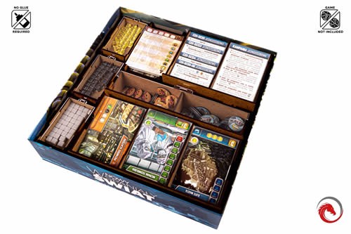 The insert is durable and made of high-quality HDF and plexiglass. To assemble it, there is no glue required. It allows you to hold all components inside the box. You can see the suggested components setup on the pictures. This offer concerns only insert. The game is not included.