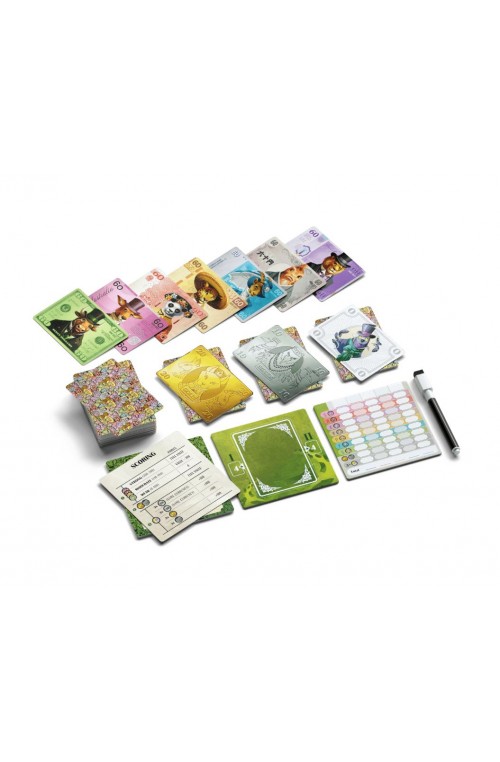 Each player starts with a hand of six cards from a deck that contains cards in seven currencies ranging in value from 20-60, along with coins worth 10. Four cards from the deck are placed face up to its left and to its right.