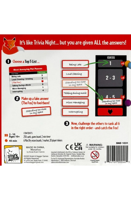 Each Round one player is the FOX. They will choose a Top Five list card category, examine all the answers and then make up an answer they think the group will rank as one of the Top Five answers.